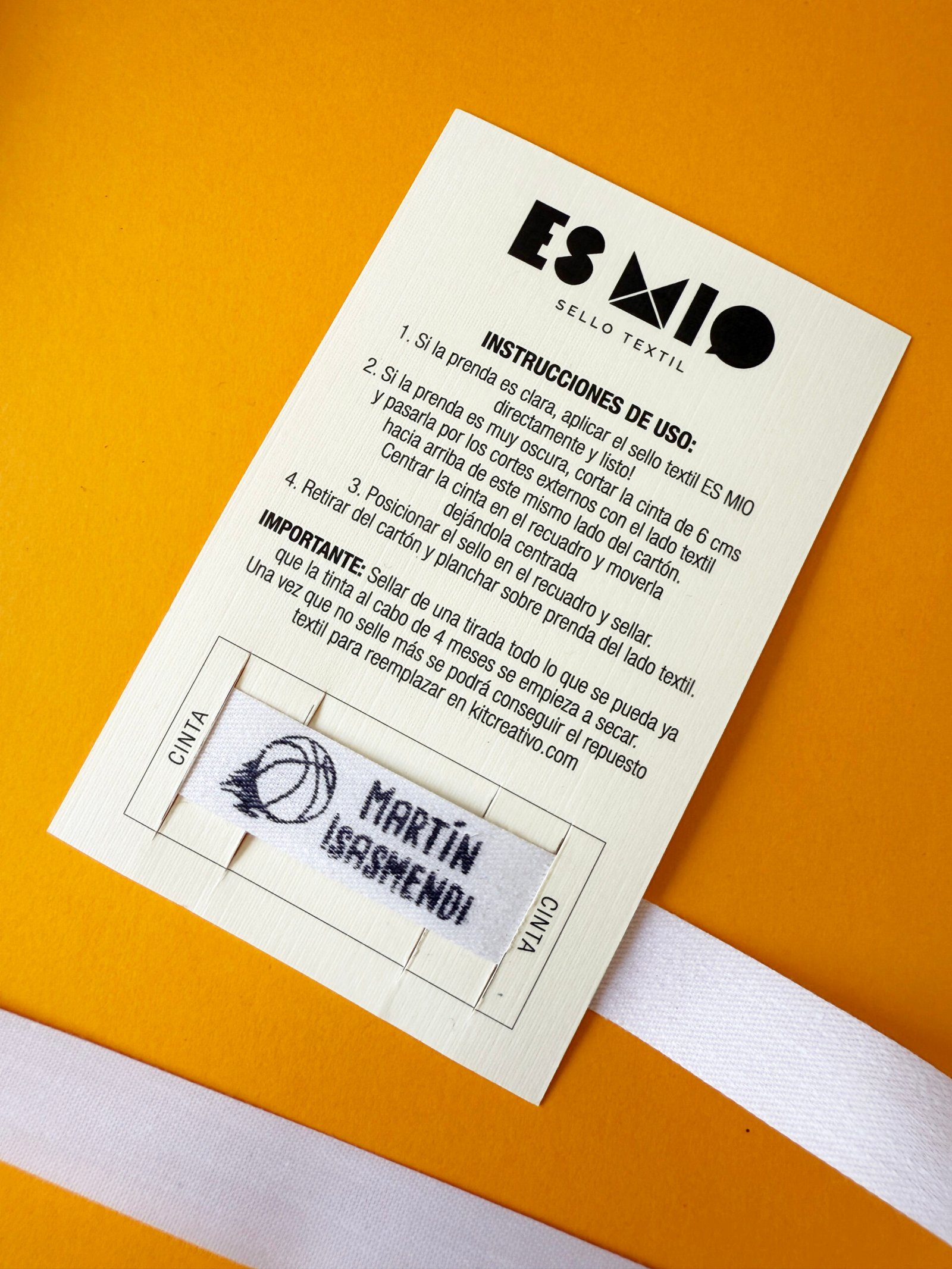 Pack con cinta para 10 etiquetas termoadhesivas blancas, para planchar y sellar con tu sello en ropa negra o muy oscura.